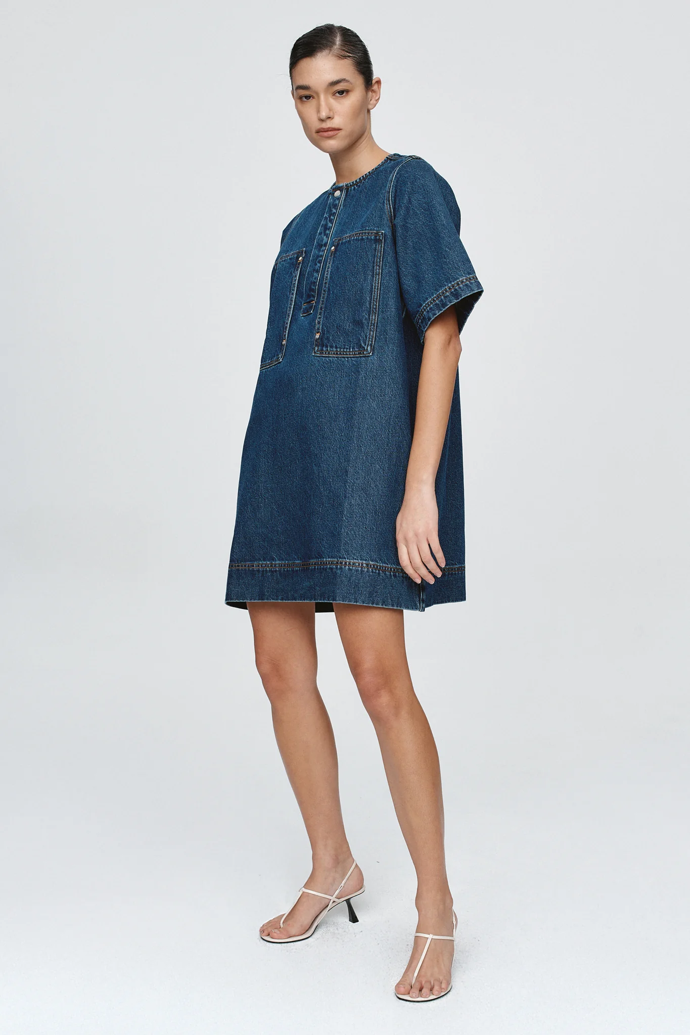 A short-sleeve dress constructed from 100% organic cotton with a relaxed, boxy shape. Features a round neckline and a concealed half placket secured with snap dome closures. Features include two oversized chest patch pockets with metal rivet reinforcement. Finished with topstitching and exaggerated hem detailing for a utility-inspired finish.