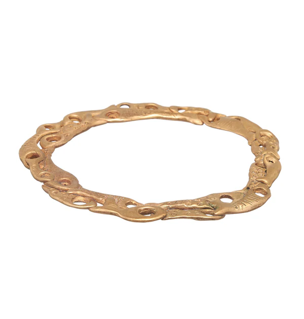 The Pesci Che Volano collection features an extensive selection of statement rings, earrings, bracelets, pendants and hooks entirely handmade in a small atelier in Florence using the ancient lost-wax casting method. The raw, unpolished metals used to make the jewellery give them a rustic, antique feel while their intricate details bear some resemblance to Etruscan works.