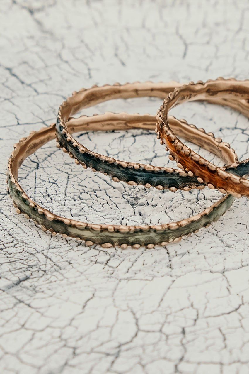 The Pesci Che Volano jewellery collection is handmade using the ancient lost-wax casting method in a small atelier in Florence, Italy. This collection of statement rings, earrings, bracelets and pendants combines bronze with materials including ebony and silver to create an ornate, yet understated style. Unique symbols are hand carved into each individual piece while irregularities and imperfections ensure no two designs are exactly the same.