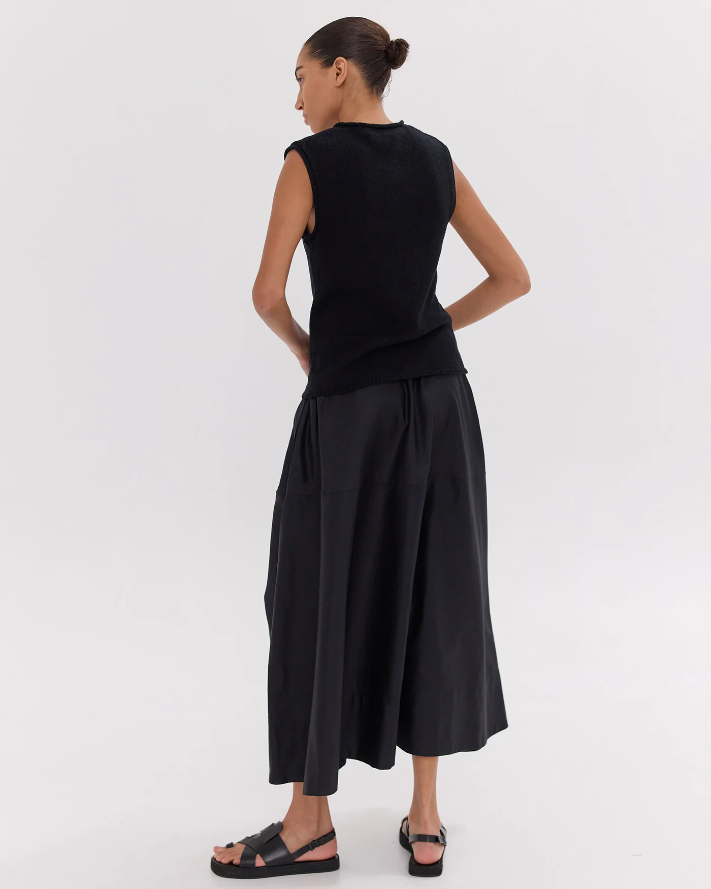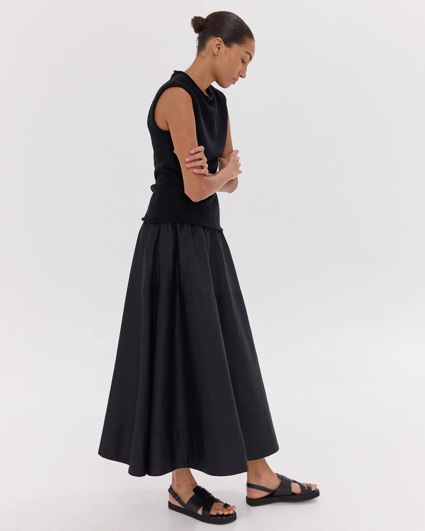 Crafted from 100% Giza cotton, this full-length skirt drapes with ease, defined by a softly gathered waist and flowing silhouette. Side-seam pockets add quiet functionality, while French seams ensure a refined finish. Light and breathable, it moves effortlessly through the seasons — a timeless piece to wear on repeat.