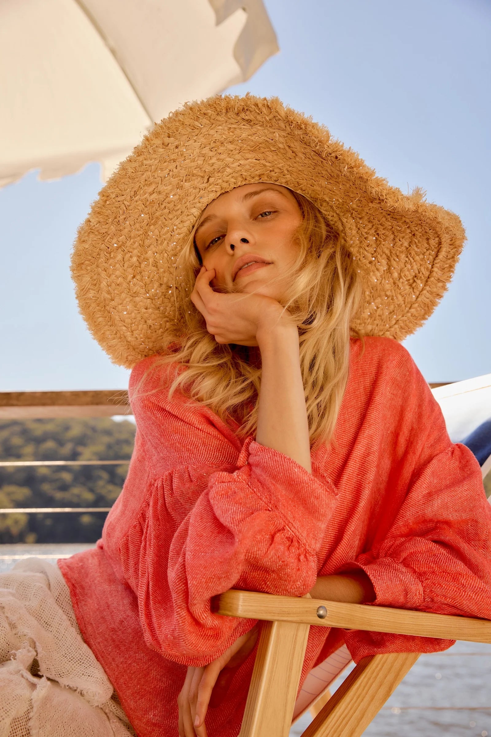 This billowing blouse is a wardrobe staple with a loose fit silhouette and balloon sleeves and buttoned cuffs. It has a subtle collar and buttons down so it can be worn closed or open. Style back over swimmers and with our Pareo’s for the perfect beach outfit.
